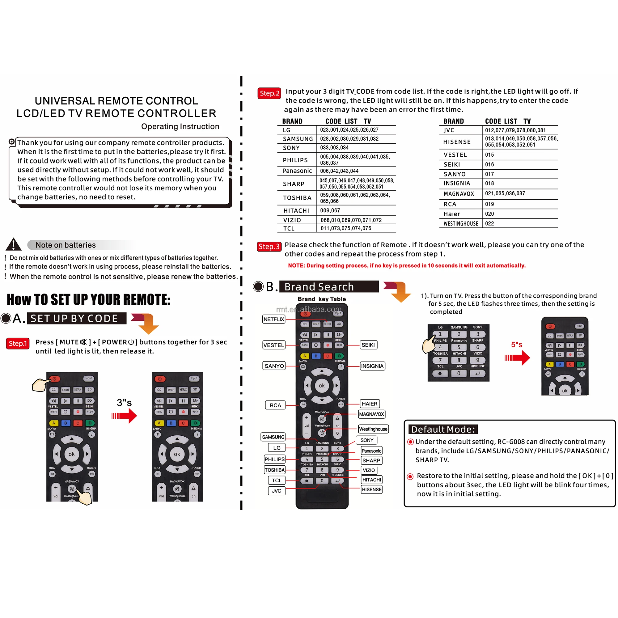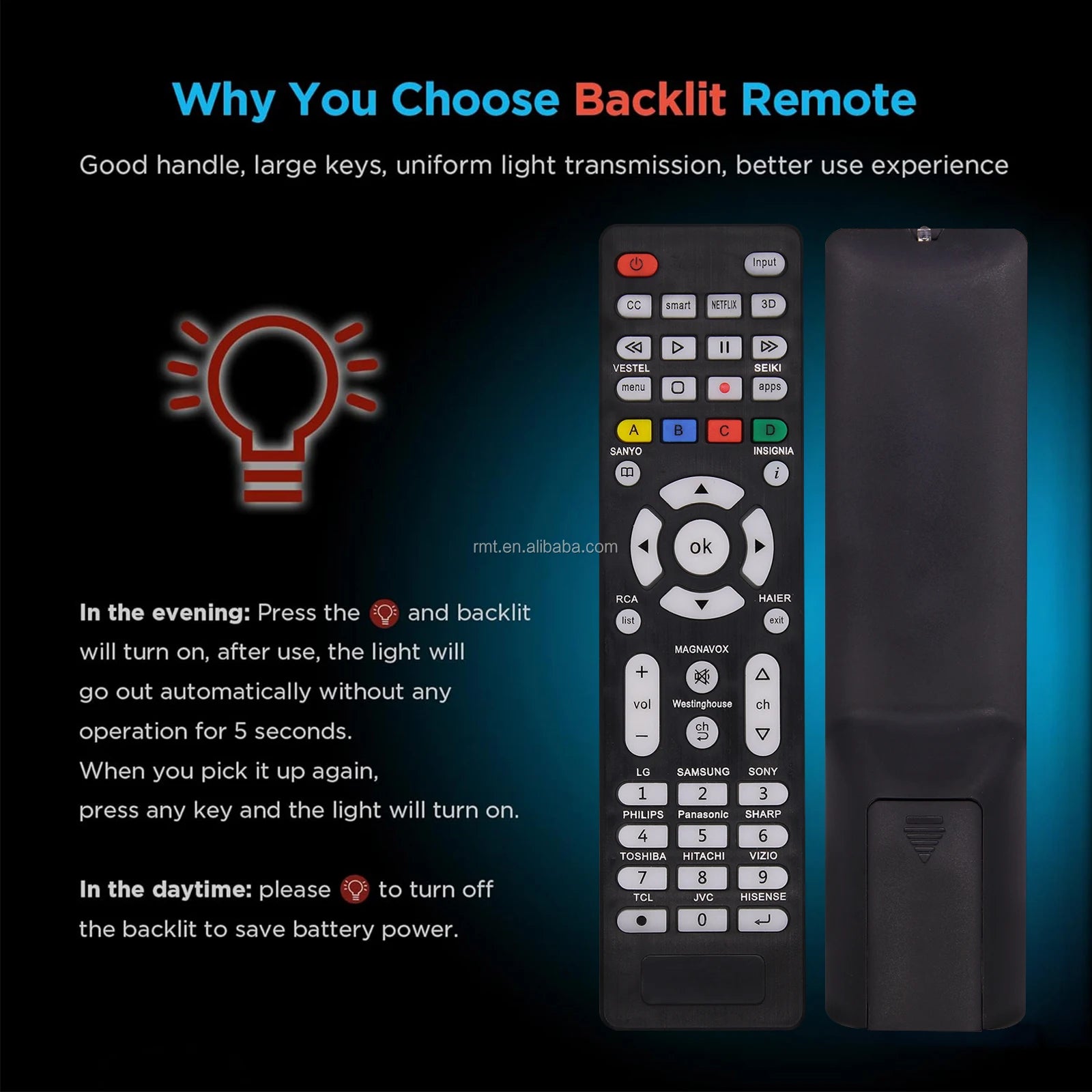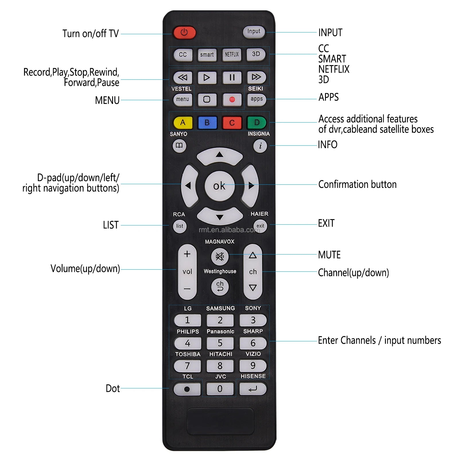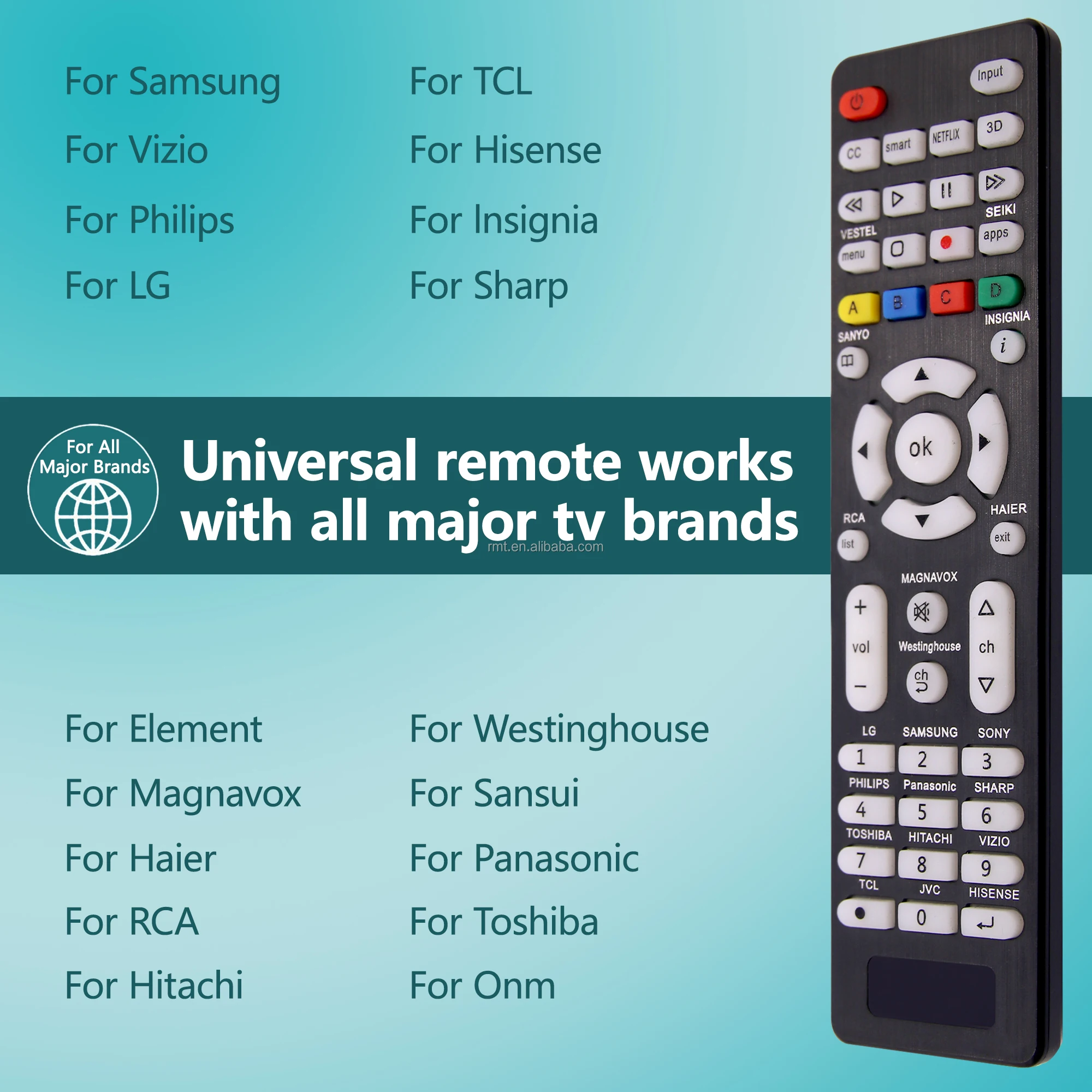 This Universal TV Remote Replacement Design for All Hitachi/ Vizio/ TCL/ Hisense/ Seiki/ Sanyo/ Insignia/ Magnavox/ RCA/ JVC/ Samsung/ Philips/ Panasonic/ Toshiba/ Haier/ Westinghouse/ Sharp/ Sony/ Vestel/ LG Smart TVs.