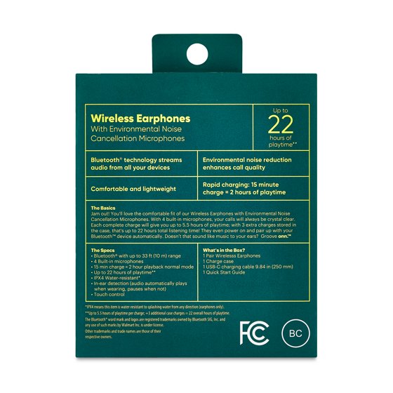 The onn Wireless Earphones with Environmental Noise Canceling Microphones provide a superior audio experience with their comfortable, wireless pod-style design and instant connect feature. These earphones are equipped with four Environmental Noise Canceling microphones, ensuring crystal-clear phone calls by filtering out background noise. With up to 22 hours of playtime, you can enjoy extended listening sessions, and a quick 15-minute charge offers an additional 2 hours of playback in normal mode. The high-definition sound delivers deep bass and clear treble, enhancing your listening pleasure. The in-ear detection feature automatically plays audio when the earphones are worn and pauses when they are removed, adding to the convenience. The independent connecting capability allows each earbud to connect to your device individually. With a Bluetooth range of up to 33 feet (10 meters) and intuitive touch controls, the onn Wireless Earphones with Environmental Noise Canceling Microphones provide a seamless and high-quality audio experience.